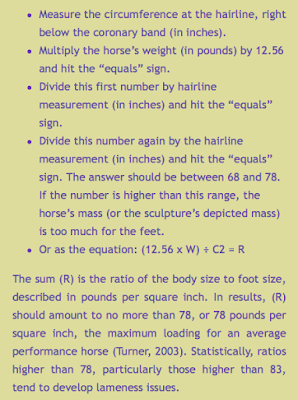 Scaled down, we can apply this ratio by estimating how many "inches" our sculpted coronets are in circumference and then estimating the "living weight" of our sculpture then plugging those numbers into the equation. Pretty soon then we'll develop a mental library of hoof sizes that fit inside this spectrum for a short cut. (We also come to learn that hoof size isn't gauged by the length of the hoof wall, but by the circumference of the coronet band.)